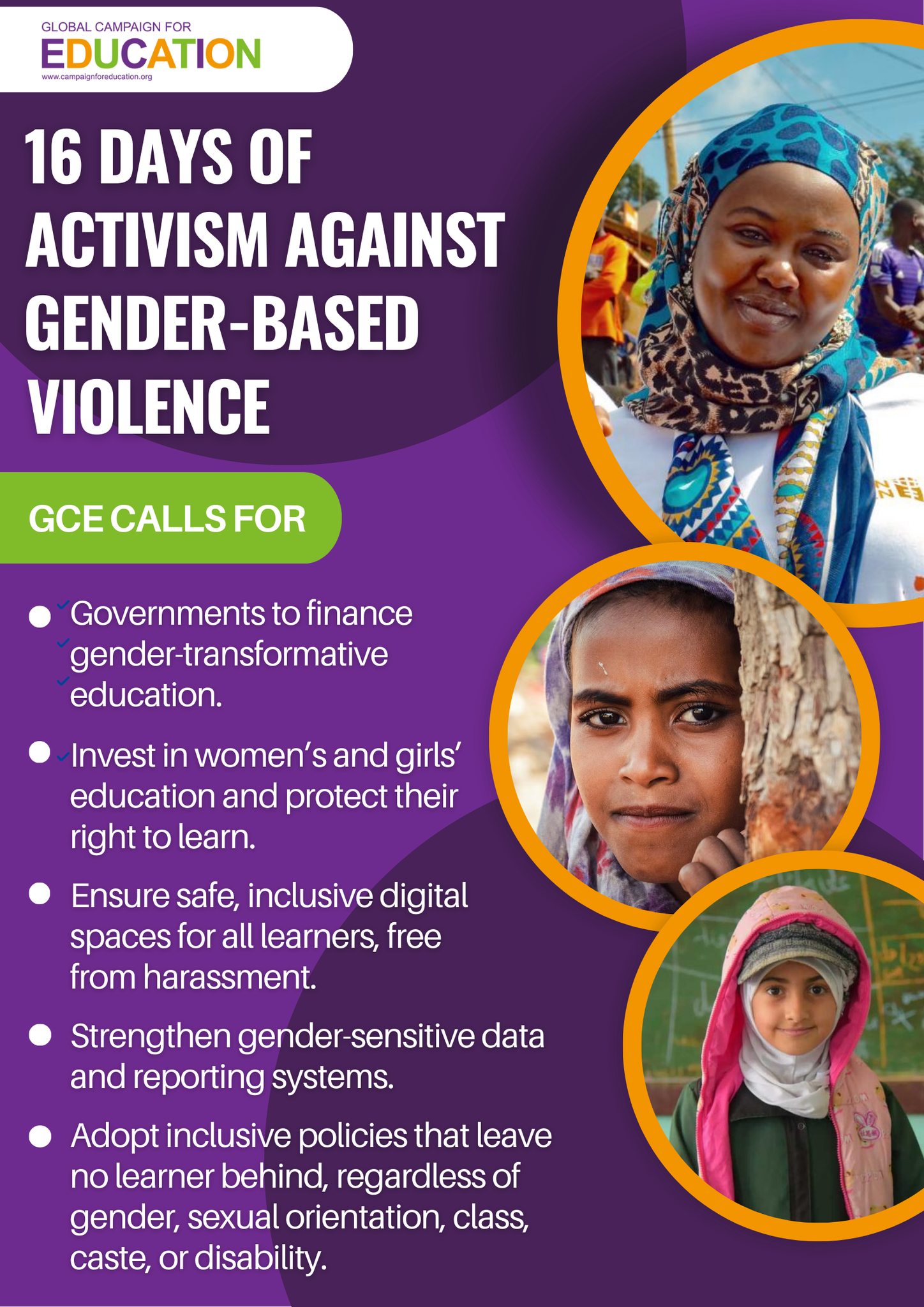 Le GCE défend l’éducation comme un droit fondamental pour tous, sans distinction de genre, d’orientation sexuelle, d’expression de genre, d’identité ou de caractéristiques sexuelles. Le mouvement comprend que l’inégalité entre les genres est liée à d’autres formes d’oppression telles que le racisme, le capacitisme et la xénophobie, et qu’elle nécessite des réponses qui combattent simultanément les multiples discriminations.