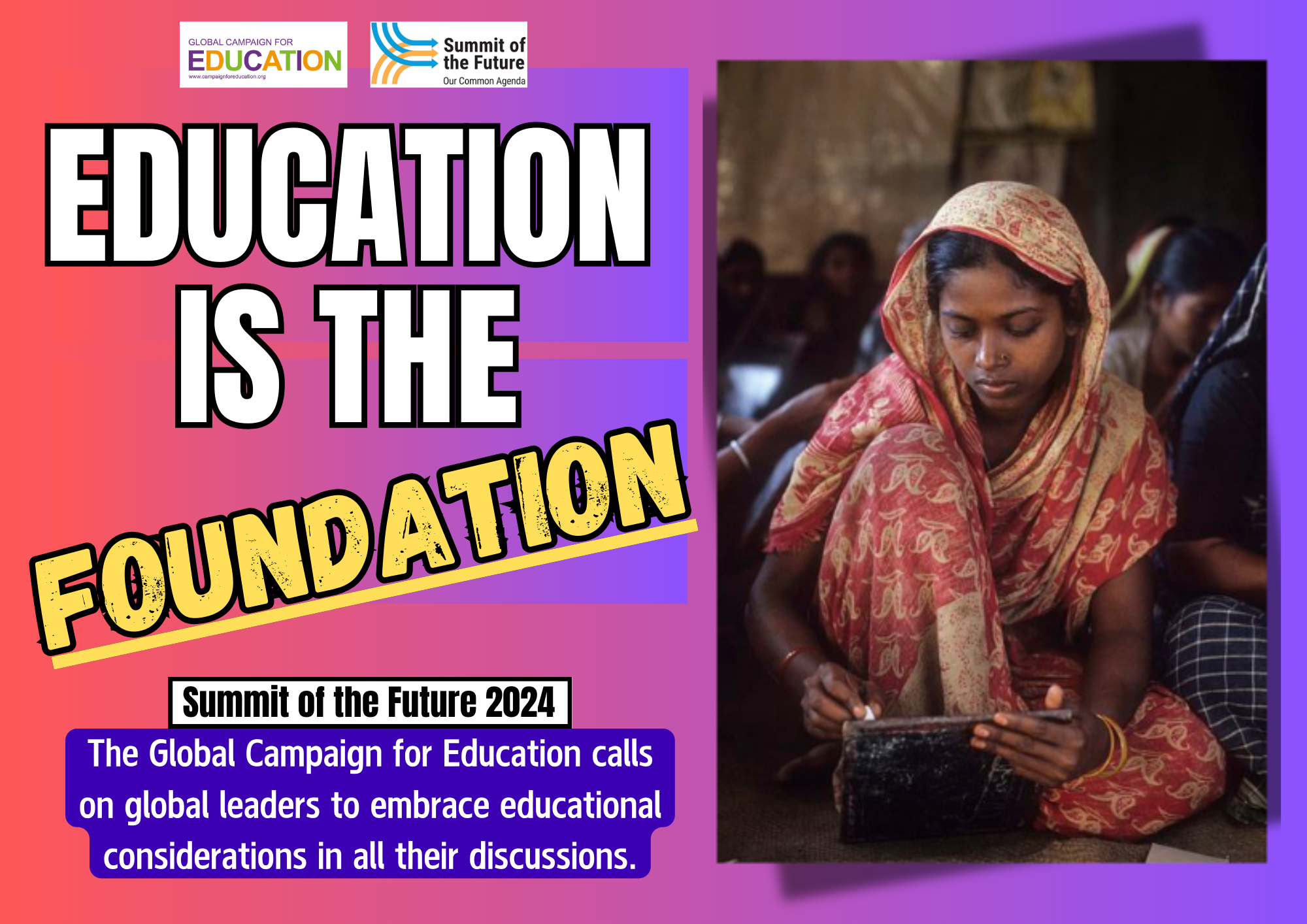 Depuis l’annonce du Sommet de l’avenir (SOTF), la Campagne mondiale pour l’éducation a reconnu l’importance de cette initiative et a appelé les États membres de l’ONU, en particulier les représentants de la Namibie et de l’Allemagne, facilitateurs de l’événement, à inclure des engagements substantiels en matière d’éducation et d’apprentissage tout au long de la vie, reconnaissant son potentiel transformateur pour les générations actuelles et futures.